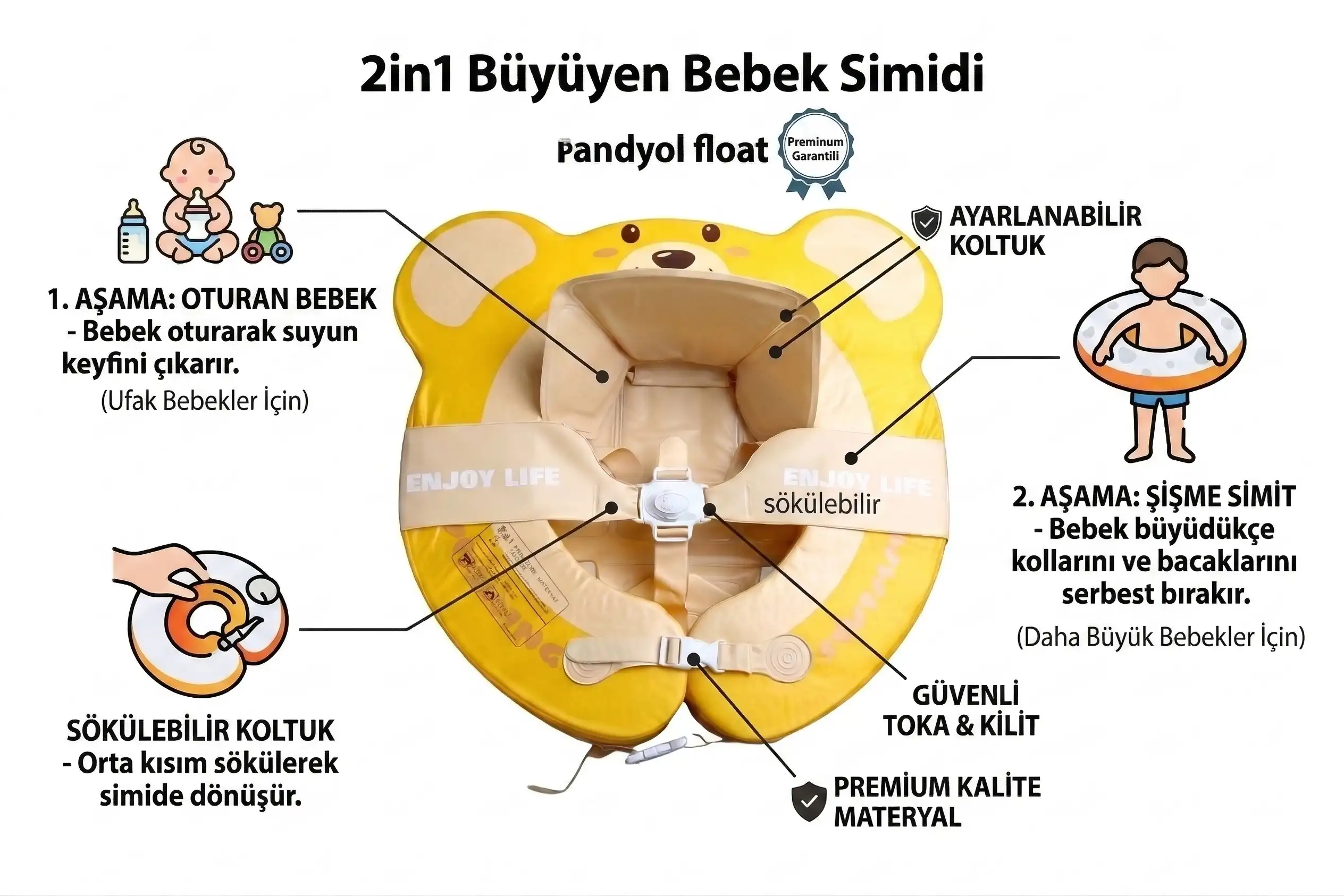 • Maksimum Konfor: 'Enjoy Life' sloganlı emniyet kemeri ve göğüs desteği, bebeğinizin su içinde öne veya arkaya kaymasını önler.