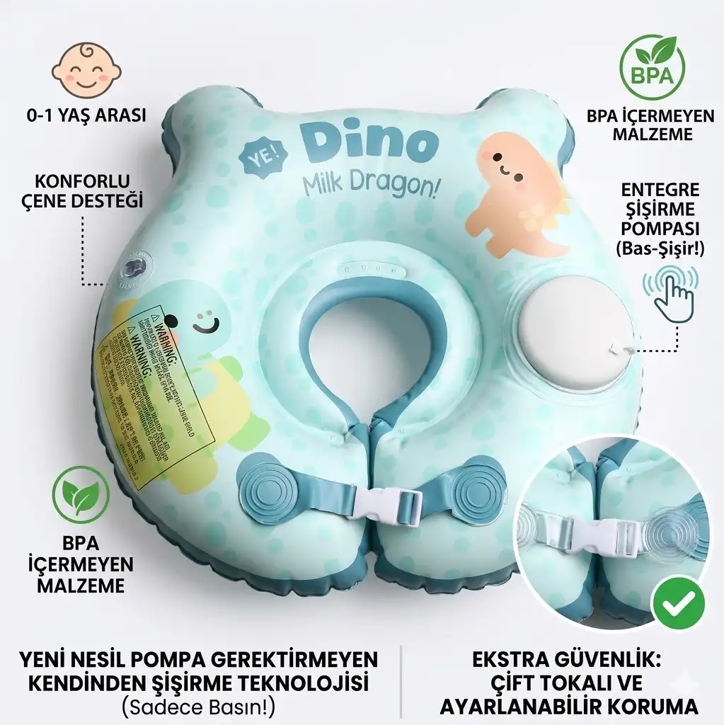"Bebeğinizin suyla ilk tanışması en güvenli ve eğlenceli haliyle başlıyor! Sevimli Dino Milk Dragon tasarımıyla dikkat çeken bu özel boyun simidi, bebeklerin su içerisinde doğal hareket kabiliyetini kısıtlamadan güvenle yüzmesini sağlar.