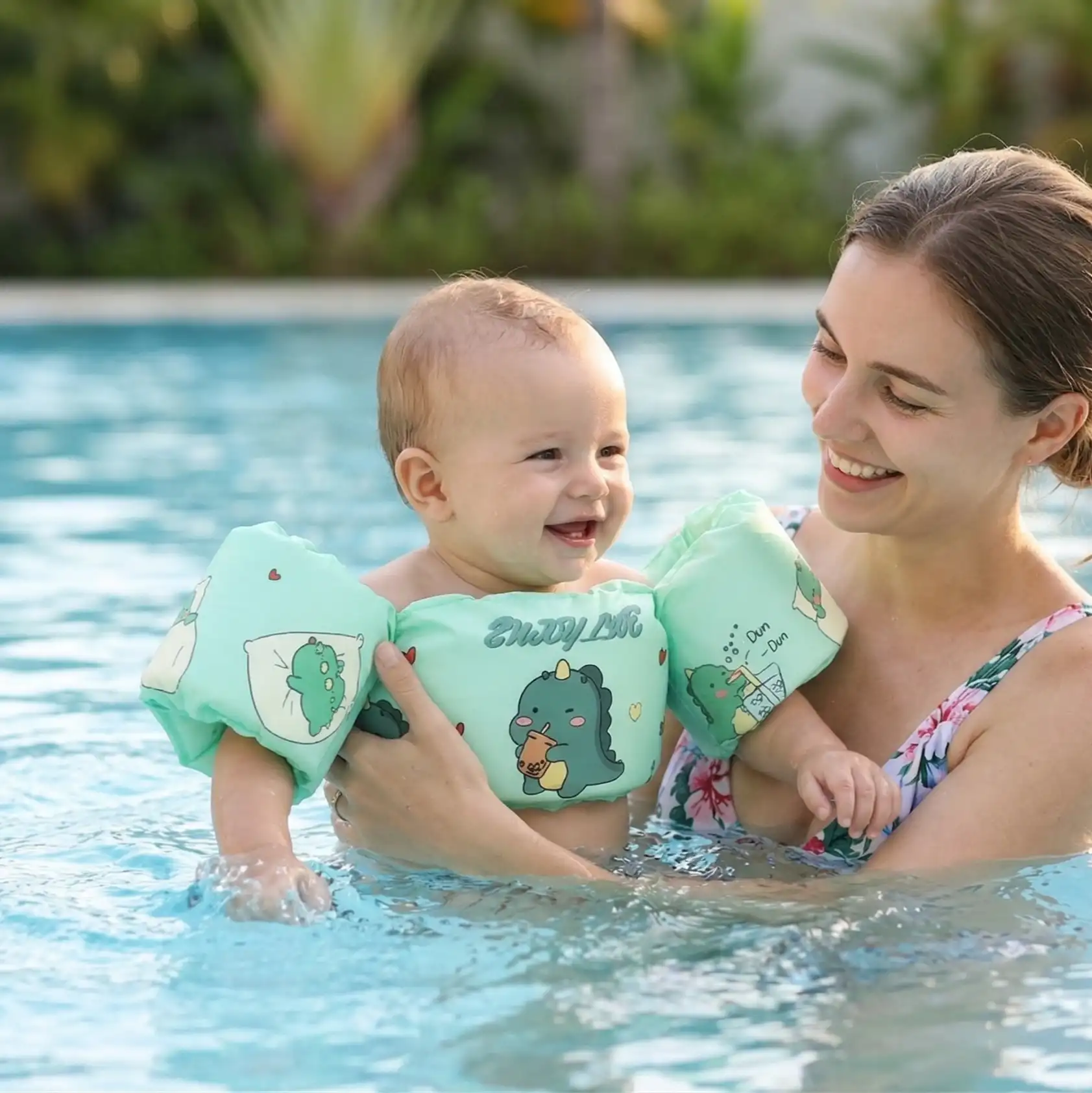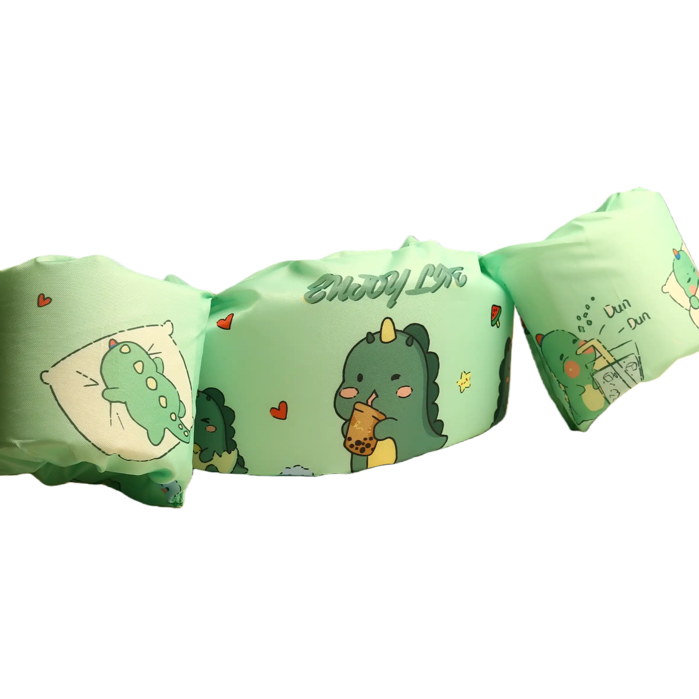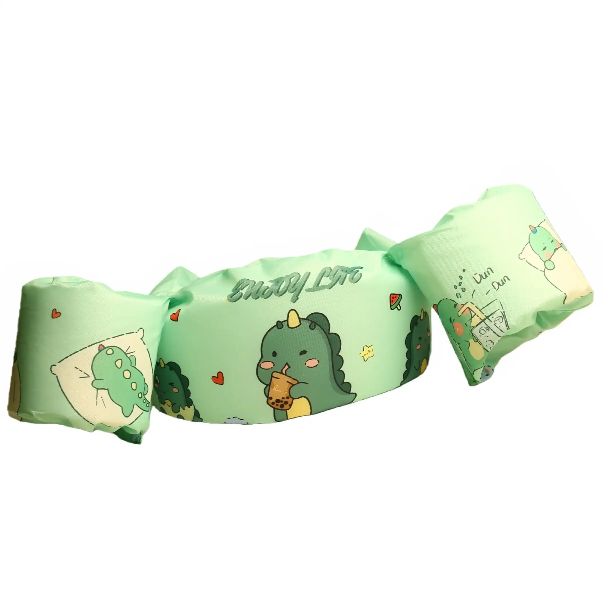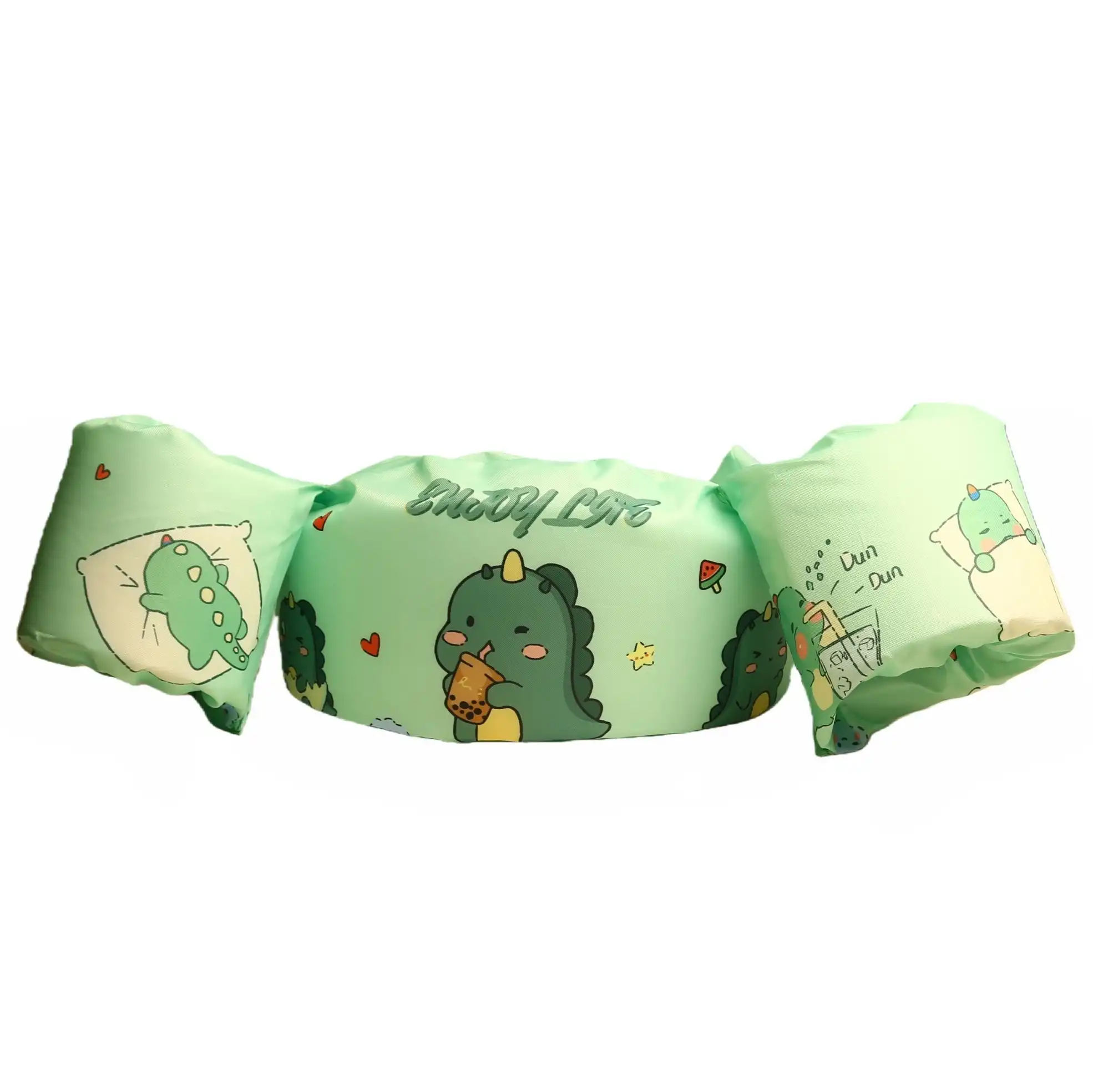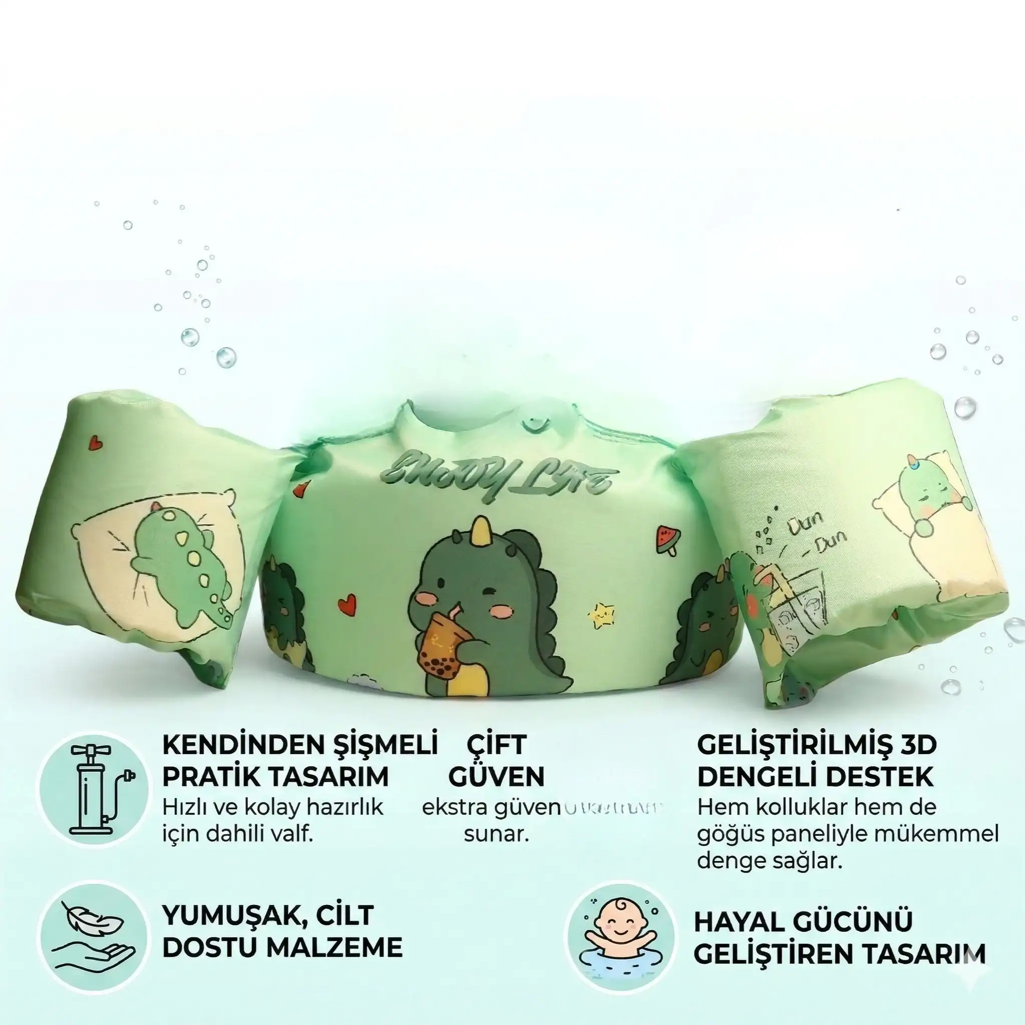 Küçük kaşiflerin suyun tadını özgürce ve güvenle çıkarması için tasarlanan dinozor desenli çocuk kollu can yeleği, batmaz yapısı ve entegre kollukları sayesinde su üzerinde mükemmel denge sağlar.