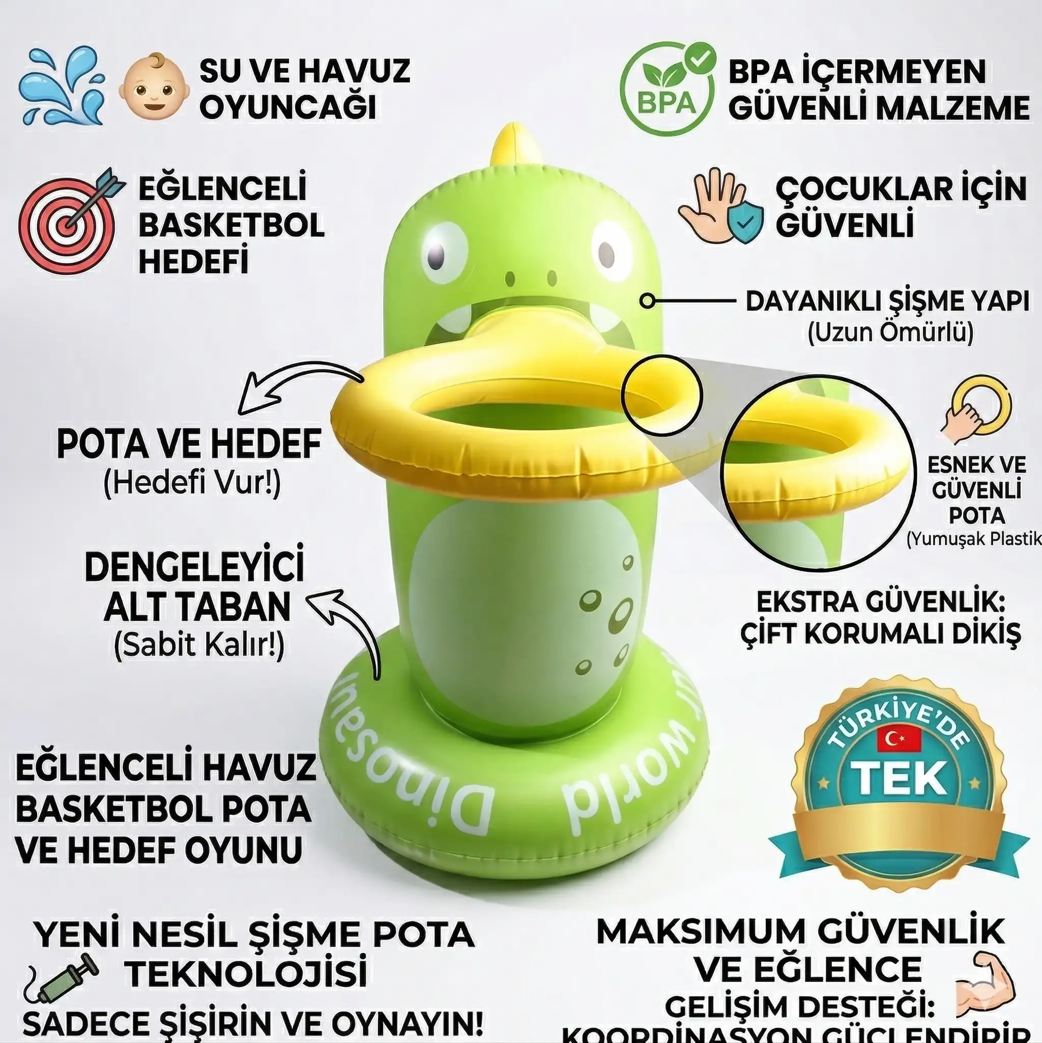 "Yazın en eğlenceli havuz partilerine hazır mısınız? Dinosaur World şişme basketbol potası ile havuz keyfini bir üst seviyeye taşıyın! Hem çocukların motor becerilerini geliştiren hem de yetişkinlerin havuzda rekabet dolu anlar yaşamasını sağlayan bu set, yaz tatilinizin vazgeçilmezi olacak.