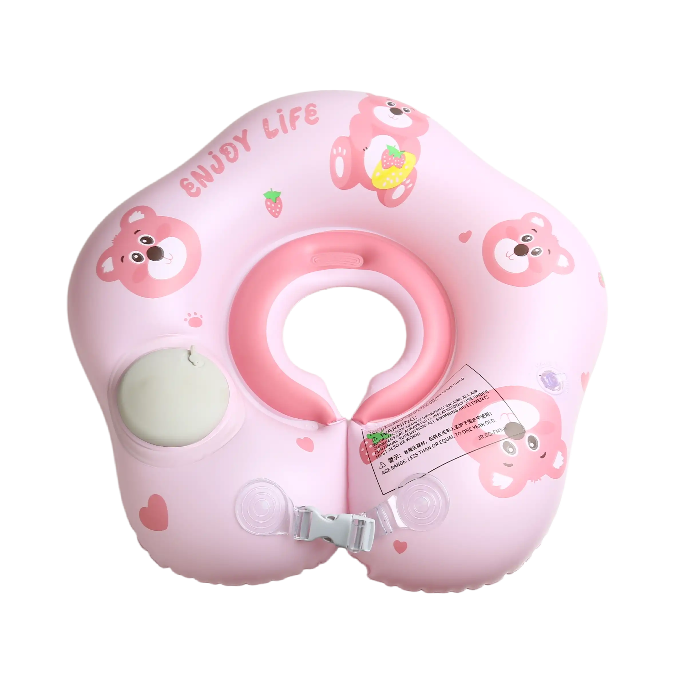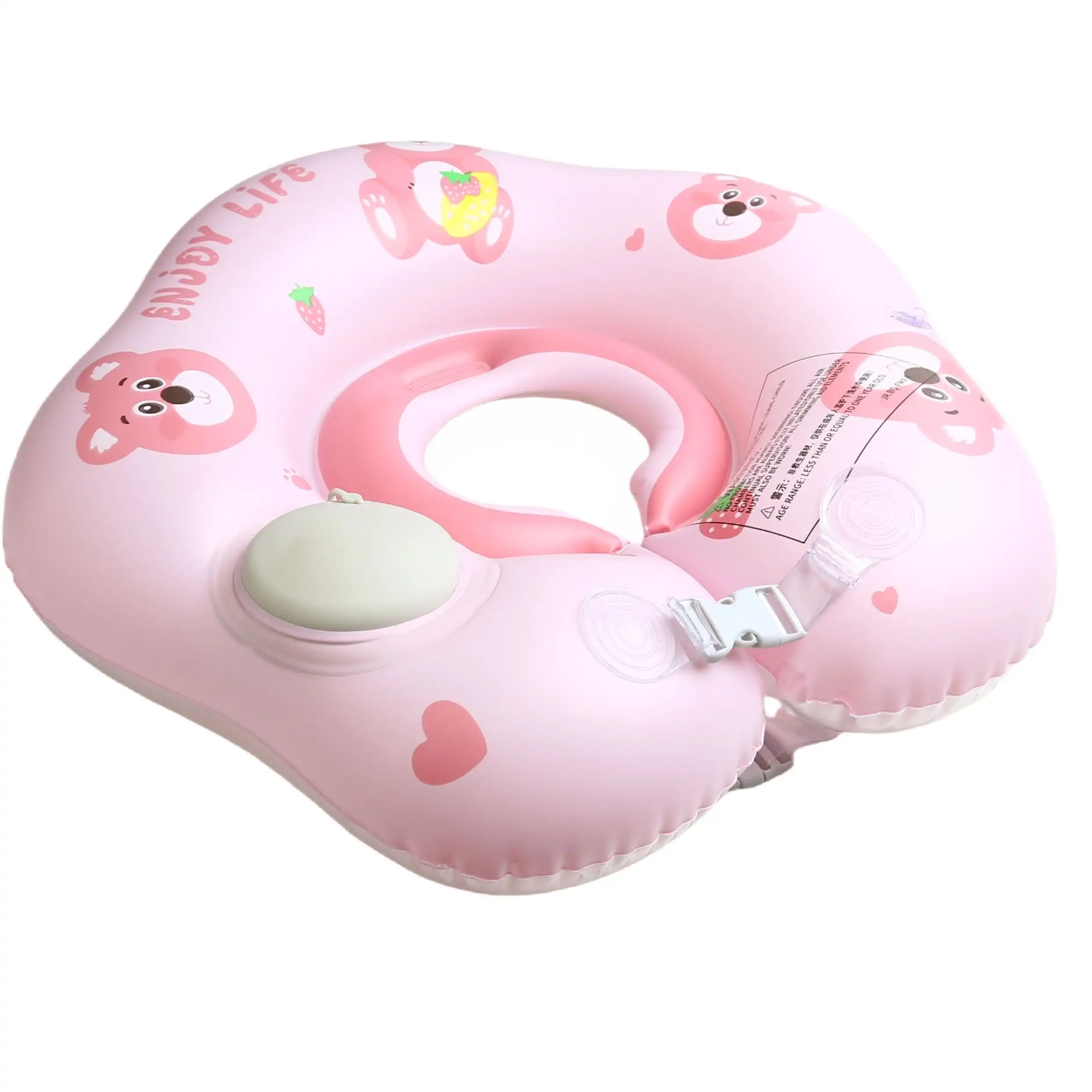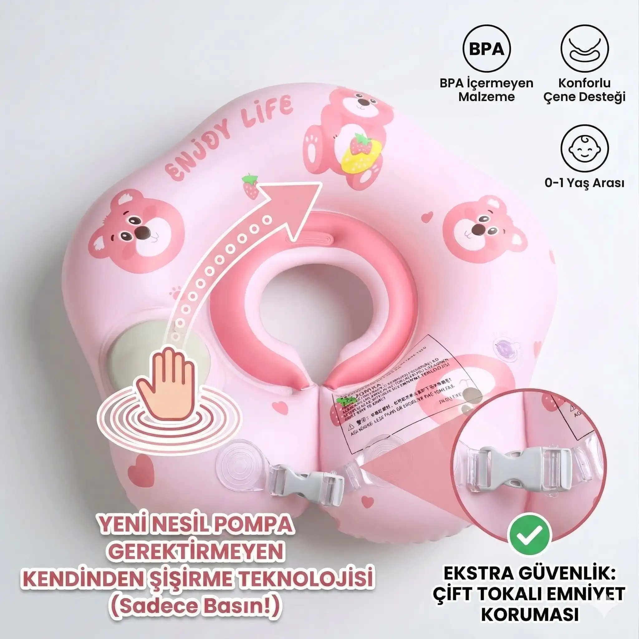 Bebeğinizin suyla tanıştığı o ilk anlar hem unutulmaz hem de çok güvenli olmalı. Sevimli pembe ayı figürleri (çilekli olanı da var!) ve ergonomik tasarımıyla öne çıkan Pembe Ayı Bebek Boyun Yüzme Simidi, küçüklerin suyun tadını özgürce çıkarmasını sağlar. "ENJOY LIFE" (Hayatın Tadını Çıkar) mottosuyla üretilen bu simit, güvenlikten ödün vermez.